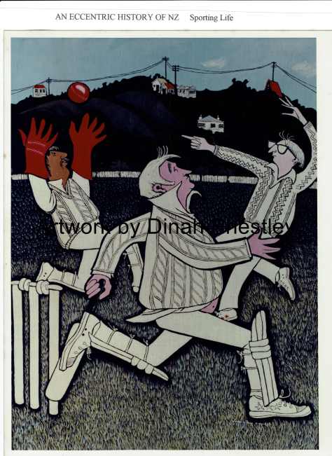 This is Tony Burton’s team, the Eastern Cricket Club, engaged in the manly sport of cricket at Miramar Park, Wellington. They are a loveable assortment of ageing taxi drivers, chefs, dusties, fishermen, meteorologists, artists, journalists and cabinet makers. A keen, rakish, rumpled look characterises them all.